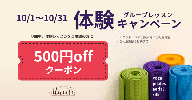 期間中、体験レッスン(グループレッスン)をご受講くださった方に、特別なクーポンをプレゼントいたします。